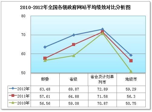 2012年各級政府網(wǎng)站平均績效水平均比上一年略有提高,并呈逐年上升狀態(tài)。其中,省級政府網(wǎng)站進步最為明顯,由2010年的59.08分到2011年的64.88分,再到2012年取得69.87分,平均績效分跨度達10.79分。另外,部委、地級市政府網(wǎng)站進步也較為明顯。但省會及計劃單列市政府網(wǎng)站的平均績效得分均保持在70分左右,雖提升緩慢,但總體水平保持穩(wěn)步增長態(tài)勢。