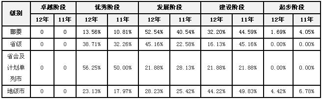 從地級市政府網(wǎng)站發(fā)展階段比較來看,最高集中處于“建設階段”,所占比例為44.22%,較2011年下降了5.61%,其次是“發(fā)展階段”與“優(yōu)秀階段”,所占比例均比2011年有所提升,且“起步階段”網(wǎng)站集中度在逐步減小。