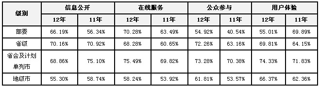 各級政府網(wǎng)站的在線服務與公眾參與指標平均得分率相比2011年均有不同程度的提升,部委政府網(wǎng)站的公眾參與水平雖然不高,但提升最快,相比2011年,提升了14.38%。此外,由于信息公開與用戶體驗指標的側重點有所變化,部分級別網(wǎng)站平均得分率有所下降,如省會及計劃單列市、地級市政府網(wǎng)站的信息公開平均得分率有所降低。